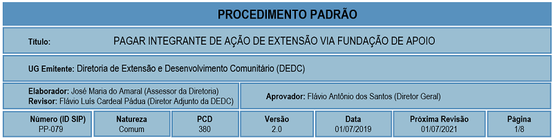 4.2.1 Todos os pagamentos a que se refere o presente Procedimento-Padrão devem estar vinculados a Ações de Extensão que, previamente, foram objeto de processos seletivos e autorizativos no âmbito de atuação da Diretoria de Extensão e Desenvolvimento Comunitário.